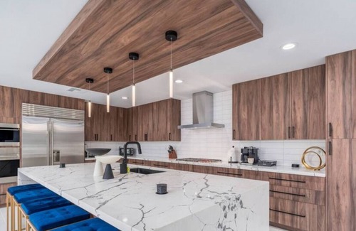 The cabinets and drawers are stocked with the cookware and utensils you need to whip up delicious meals during your stay- you’ll even have a fully stocked cocktail-making set! You can enjoy a meal at the counter stools or sit around one of 4 different dining options, inside and out, with modern dining table sets for 16+ that overlooks the swimming pool in the backyard.