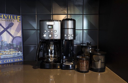 Nashvilleurbanretreats presents this spacious 2 bed 2 bath that was outfitted by Nashville's best designer. Sliding doors lead to the largest outdoor deck with an electric grill in this boutique building. The deck has a curated space for outdoor dining and entertainment with a few fun outdoor games to loosen up before heading out to downtown Nashville, which is minutes away. Have some fun posing in front of a mural done by one of our favorite Nashville muralists as well as the cool neon angel wings.