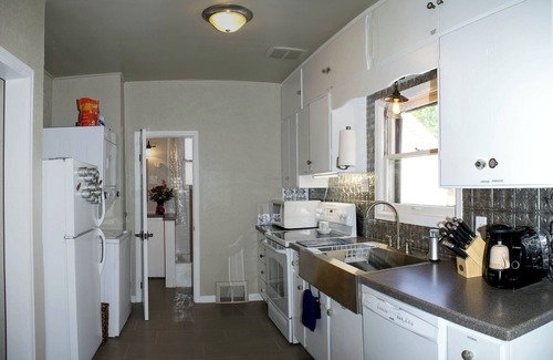 Enjoy the enclosed front porch, private back patio, off-street parking and carriage house for bikes or sporting equipment. All new contemporary yet comfortable decor and furnishings that complement the charm of the original features like the hardwood floors and built-in-place cabinets! Washer and dryer, outdoor grill and cooking station with comfortable private back patio that is shaded in the afternoons and has solar lighting for enjoying our comfortable Colorado evenings. Bedrooms feature ceiling fans, dresser, full size closet and Queen beds. The comfortable living area has a Queen size sleeper sofa, 55" smart television with Roku. There is a convenient desk area with internet access for those who need to work while they play. The bathroom has everything you might need including a hairdryer and make up mirror. In the renovation of the home, we opened the kitchen to the living area and provided a cool table space convenient for eating, working and visiting. We have a highchair, Pack & Play and baby seat / swing for those with small children. The kitchen is equipped with a stainless farm sink, stove/oven, dishwasher, disposal, microwave, k-cup coffee maker, toaster, mixer, all cookware and dinnerware. You should only need to get a few groceries and personal items!
