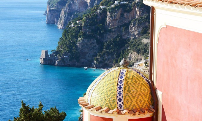 This magnificent property stands, with its unique burgundy color, on a hillside above Positano’s bay.