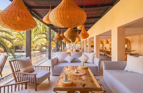 Spread over one hectare and surrounded by plains and the mountains of Atlas, this is the right place where to spend unforgettable holiday in Morocco, the place offers beautiful views and a large garden, full of palm tress and plant. This space hosts the heated swimming pool , 25 meters long, a pool house 200 square meters, there is a terrace with sun lounges for relaxing, table and chairs, chill areas with sofas and a lot of space where to enjoy the peace of silence.