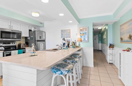 This beautiful two bedroom condo makes for the perfect family getaway. Located on the fifth floor of The Oceans. Sit back, and enjoy an incredible panoramic view of the ocean from the pool or one of the private balcony's. After a relaxing day by the pool or on the beach, you and your family can enjoy all that Cherry Grove has to offer. Fishing, golfing, dining at a seafood restaurant, shopping at boutiques, and parasailing are just the beginning of all the memories you will create here. This oceanfront condo is walking distance to restaurants, groceries, mini golf, ice cream, and endless water activities. You will be completely relaxed and comfortable during your stay, with high quality appliances, and a spacious gathering area.