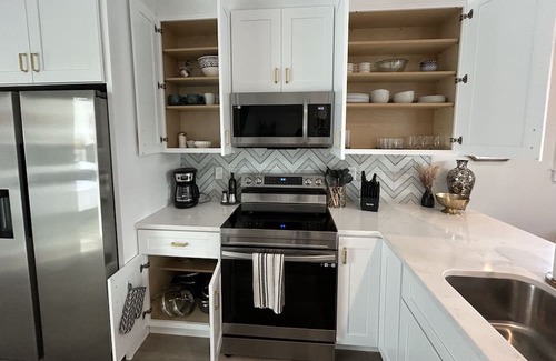 With a dining table that seats four, three benches along the island, and a kitchen stocked with everything you need to make a great meal, you could actually host your next Thanksgiving here. Complementary coffee, creamer and sugar are provided, alongside a drip coffee maker.