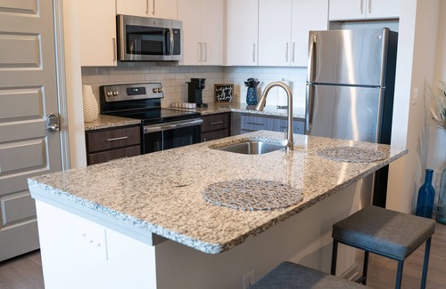 The kitchen is fully equipped with everything you need to prepare a delicious meal during your stay. It features granite counter tops, stainless steel appliances, including a refrigerator, oven, microwave, and dishwasher. There is also a dining table with seating for four.