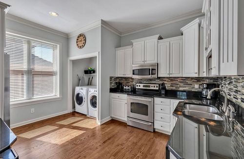 The fully equipped kitchen features stainless steel appliances, ample counter space, and a laundry closet with a washer and dryer.
