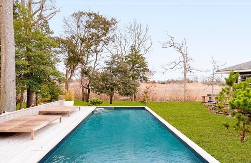 A bungalow-style home on Long Island’s South Shore where you can observe the wetlands wildlife and hear the sounds of the waves from the Great South Bay, a stone's throw from the house. This open, light-filled space features a living room with a fireplace, a kitchen and dining area, and an en-suite bedroom with a soaking tub. The heated lap pool with cabana (refrigerator, couch and AC) and outdoor shower (!) are surrounded by acres of natural preserve, making this a true retreat for design and nature lovers. A short drive (or a longer bike ride) can offer you access to Fire Island's beautiful beaches or a stroll through neighboring Bellport Village for shopping and some coffee. The house is a true sanctuary for those looking to escape and relax.