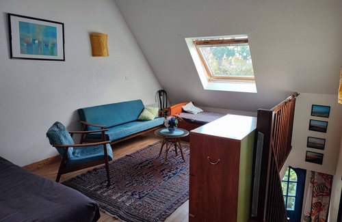 Upstairs studio: living room with sofa and armchairs, American kitchen equipped with fridge and induction hob, bathroom with shower and toilet.