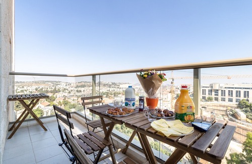 The apartment is in the Neviim Court ! 1-minute walk from the famous Ben Yehuda street, 6 minutes from Mamilla center and 8 minutes from old city. The facility is the prestigious " Neviim Court " ! The apartment is on the 7th floor (Shabat elevator), 90ms, 2 bedrooms (king size and singles) 7 sleeps, 2 bathrooms, 1.5 terrace. It is fully equipped (washing machine, dryer, dishwasher, iron, hair dryer ...). Several dining services, Kosher, shabbat plata, water heater ... Satellite channels, wi-fi. You will own your car in private parking. Security at the entrance of the building (lobby) is assured 24h / 24. We will provide: first cleaning, fresh bedding + replacement, towels, toilet paper, espresso coffee capsules, washing powder, soap, shampoo.