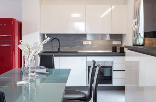 The large glass openings broaden the internal space with the spectacular surrounding landscape. The newly renovated apartment designed to offer maximum relaxation and well-being, offers a shower cabin with a hydromassage Turkish bath, ski storage with bootdryer, a private garage in the center of Cervinia, a panoramic internal terrace, 4K 65'' OLED smart TV, a modern equipped kitchen, numerous pillows for every need, an elevator, and a shopping area under the house.