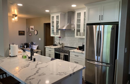 The kitchen was updated in 2020 and is fully stocked with all kitchen essentials including high-end All Clad pots and pans, Soho table wear, countertop appliances including 4 different coffee makers a Nespresso, French press, Keurig, and regular coffee pot. An electric burning range and stove, apron-front kitchen sink and high-end linens. The countertops are a beautiful white quartz and the cabinets are white with bronze hardware. All new appliances including French door fridge and new dishwasher. We also have a Kitchen Aid mixer for all your baking fun with the family.