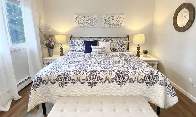 Down the hall, you will find two inviting bedrooms. The primary bedroom has a new king bed, black-out blinds, and a convenient walk-in closet. Across the hall, the second bedroom has a new queen bed and a window facing the backyard, where birch trees offer a year-round spectacle, whether in their lush green, golden, or snow-covered attire.