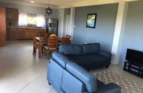 Powye Villa Unit #2: Two (2) bedrooms, one (1) bathroom with porcelain tiles, hardwood kitchen cupboards with granite counter top and hardwood dining table which sits six (6) persons. The two bedrooms share a modern and spacious bathroom.