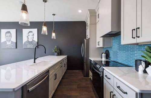 Kitchen: Fully equipped with stainless steel appliances, Keurig Duo coffee setup, milk frother, glassware, and a bold teal tile backsplash.