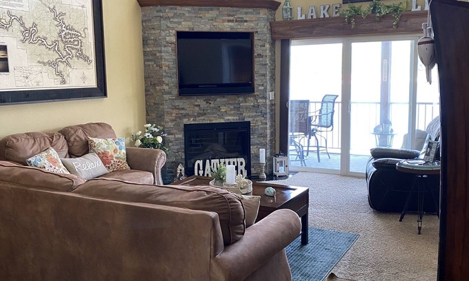 Miramar is a great spot to get away and relax from everything that life throws at you. This condo sits on the top level of building 245. It has 2 bedrooms plus a loft with 2 double beds, all decorated very nicely. Master suite has a King size bed and Master bath off of it, with a walk out patio door. Master bath features a vessel sink with Granite counter top and bath/shower combo. A 42 inch LED TV and blue ray player compliment the room. Bedroom #2 has a Queen bed with closet including ironing board, and bathroom with pocket door entry. The upstairs loft features 2 double beds along with TV and DVD . The main bathroom includes sink with granite counter tops with a stand up shower and linen closet with towels included. The kitchen includes nicely decorated furnishings topped with granite counters, maple cabinets and stainless appliances. A walk-in pantry gives you enough space to store all of your food and necessities for short or extended stays. Small appliances are all on hand and included for use during your stay at the lake. Washer and Dryer are included and all water for bathing and laundry is accompanied by a soft water system. For your viewing pleasure, we have provided a 46inch LED Smart TV with Blue Ray player and soundbar for an upgraded experience. An electric heat forced fireplace is also included beneath the TV within the stone surround cabinet. The patio outdoors is a great place to eat dinner or have coffee on the deck while overlooking the lake under the Hurricane Deck Bridge. There is a table with 4 barstools and multiple seats to sit on with a Stainless gas grill provided. The facility has an incredible pool and Miramar has boat slips available for rent of all sizes and kinds. If you are looking for a great getaway with the family or friends, Miramar is a place to make it all happen. We bet you can't just stay once!
