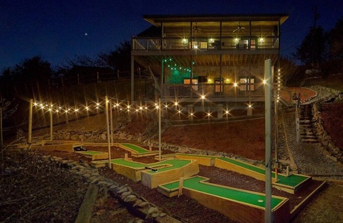 As you enter onto the lower deck, you will find the new outdoor hot tub and a large TV. What else compares to watching your favorite flick in a soothing hot tub? You also exit off of this deck to access the putt-putt course! The golf clubs and balls are provided for you inside the cabin. Putt-putt is fun for both day and night, however, our favorite is playing at night! There is ample lighting for the outdoor activities and the putt-putt course!