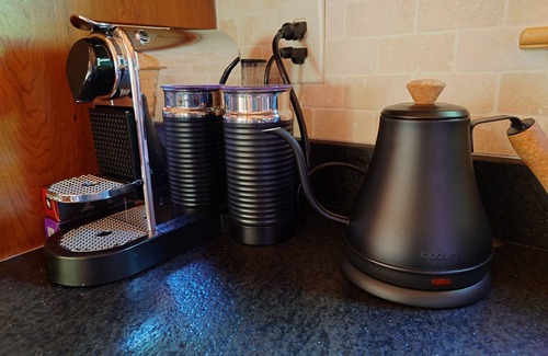 The cabin includes a variety of ways to enjoy your morning coffee or tea, whether you’re brewing indoors or carrying it riverside: