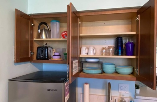 In the newly revamped kitchenette, you'll find brand-new cabinets, well-stocked kitchen supplies, beautiful quartz countertops, and a fridge with a separate freezer for your ice cream stash. We've got you covered for cooking with a plug-in cooktop, pots and pans, toaster, microwave, teapot, drip coffee maker, and all the utensils you'll need. Plus, there's a full array of plates, silverware, cups, and wine glasses to enhance your dining experience.