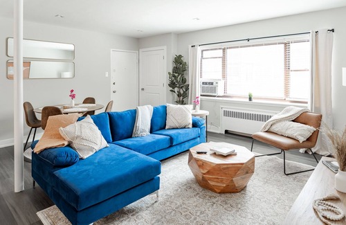 Welcome to our charming 1 bedroom, 1 bathroom apartment near Lake Michigan in Evanston, Illinois. As you enter, you'll be greeted by a cozy and inviting living space. The living room features comfortable seating, a flat-screen TV, and large windows that let in plenty of natural light. Adjacent to the living room is a fully equipped kitchen with modern appliances, including a stove, refrigerator, microwave, and coffee maker.