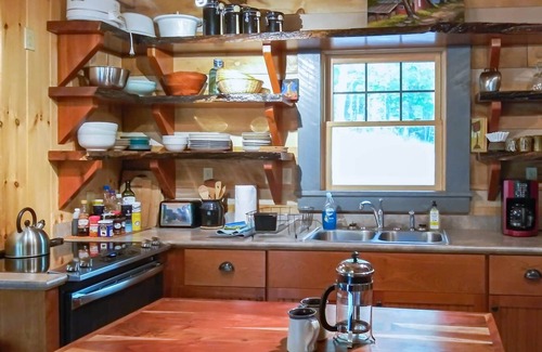 Well-crafted log cabin on a wooded hillside ~ wide front porch, private back porch, seasonal river views, firewood on site, 4 acres of wooded hillside, local art, hiking maps, games, kitchen stocked with all essentials. 2 bedrooms, 2 baths and a sleeping loft. Sleeps 8. All travelers are welcome.