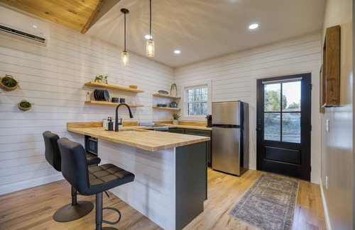 Our tiny house was created with a quiet getaway in mind. Bring your loved one, your best friend or just yourself. The front porch boasts a small table for two, ideal for enjoying morning coffee as the sun rises. On the back porch, you’ll find rocking chairs for a peaceful retreat, and of course, the outdoor bathtub – a true favorite feature for those who enjoy soaking while taking in the natural beauty surrounding you. For evening relaxation, gather around the gas firepit on the patio, where you can enjoy a fire under the stars!