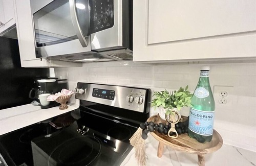 - Gorgeous kitchen with beautiful cabinetry, quartz counters, stainless appliances – fully stocked and equipped for meals at home