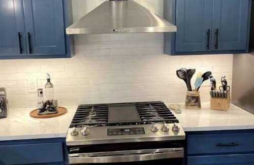The fully equipped kitchen embraces a contemporary aesthetic with sleek quartz countertops, offering a touch of sophistication. Your culinary needs are met with precision, complete with a Keurig coffee pot and essential kitchen supplies.