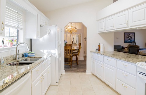 The home has granite counters in the kitchen and master bath. The upper kitchen cabinets were raised so that you can enjoy the view of the water while preparing meals. Kitchen is nicely equipped and includes a pantry. There's lots of lighting in the kitchen with recessed lights, plant ledge lights, over cabinet and under cabinet counter top lights.