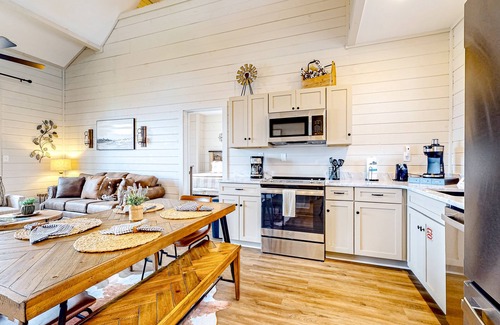 Built in 2023, this cabin was beautifully designed and decorated in a modern-farmhouse style. Step inside to find lofty ceilings, bright and airy rooms, and a well-appointed kitchen with stainless steel appliances and gather around the eat-in dining table for nightly dinners
