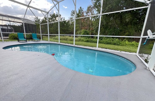 This light-filled 1,844 sq. ft. vacation home features central A/C and an open living area with direct access to the private pool deck overlooking a tranquil wooded conservation area — perfect for unwinding after a long day at the parks.