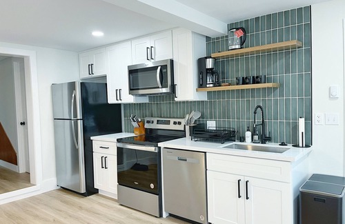 The guest suite is located on the basement floor of a detached home, and is completely seperate from the unit above. The entrance opens to a stylish, newly renovated kitchen, a living space with West Elm furnishings and a smart TV, and a dining set for four. The kitchen is fully stocked with everything you'll need to cook during your stay, as well as coffee and tea supplies. The suite has two cozy bedrooms - the first features a king bed and the second has two twin beds. The bathroom is also newly renovated and features a tile shower surround and full sized bathtub. A laundry room and an office with a workstation round out the unit, and fiber optic internet ensures a reliable and high performance connection for guests looking to stream or work remotely during their stay.