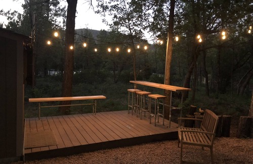 This newly remodeled 3 bedroom, 2 bath cabin sleeps up to 7 people and is nestled under tall pine trees providing a serene, private, relaxing place to get away from the hustle and bustle of the city and where it’s typically 20+ degrees cooler than Phoenix. Relax on the large wrap around porch with comfy rocking chairs and an outdoor table for 6 or hang out on the back covered porch where you’ll find a patio set overlooking the fire pit which also seats 4-6 people.