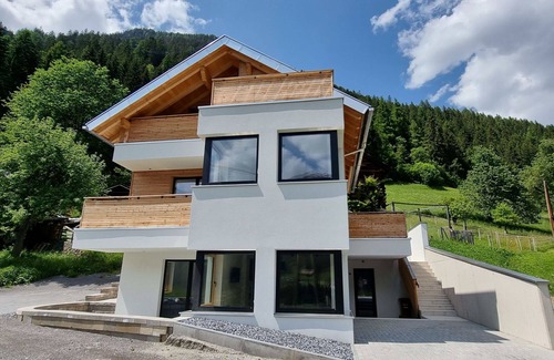 The "Holzfuchs Homes" is a very modern and beautiful apartment block, built in 2022. It offers a vacation rental experience with three stories, situated in a quiet and sunny position on a slope above See. Enjoy the convenience of having amenities like a yard, internet WiFi, parking, and the option to pay through an installment plan.