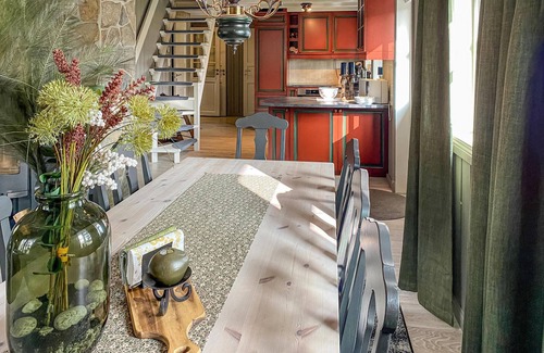 Enjoy an exclusive mountain vacation by the lake, Nysætervatnet! This luxury cottage in beautiful natural surroundings welcomes you and your large family. The child-friendly cottage offers you a number of perks and is a great fit for those who prefer both a prime location and high living comfort. Inside, the house surprises with a striking color mix of complementary red and green, which creates excitement in the interior and cozy warmth. The whole group will definitely feel at home here. Maybe you are celebrating something special? At the long dining table you can host a birthday party or simply enjoy wonderful brunches and evenings with delicious food. During the day, sit back on the large open terrace and relax in the lounge furniture. End the day with grilled delicacies in the open air.