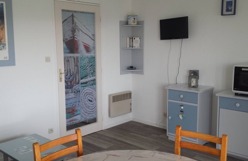 The apartment is composed of an entrance hall with cupboards, a bedroom with a double bed and a dressing room, a completely new bathroom with large walk-in shower and washing machine, separate WC, a redecorated living room with nautical style and boat knots, with TV, convertible BZ sofa for 2, a kitchen area equipped with oven, microwave, coffee maker, toaster, a balcony with garden furniture all located full South.