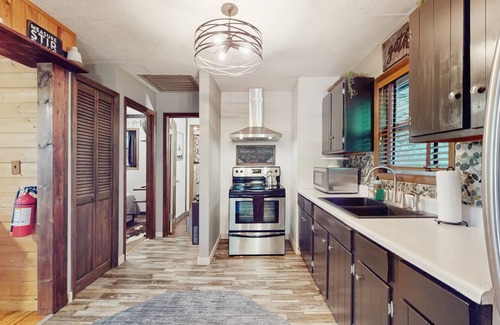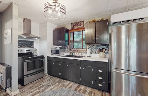 Inside, the cabin is thoughtfully equipped with all the amenities you need for a comfortable stay, including a fully stocked kitchen, cozy living area, and two inviting bedrooms. With partial AC, a washer/dryer, and WiFi, you'll feel right at home in this mountain retreat.