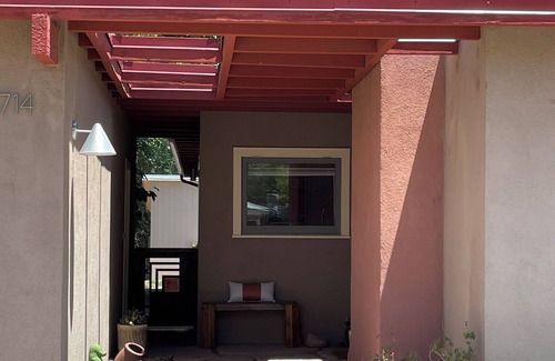 We hope you’ll enjoy this charming mid-century modern retreat in Albuquerque’s quiet and tree-filled north valley. Whether you're here for Balloon Fiesta, Old Town, or visits to historical sites, this home offers a quiet yet central location for your home base. When Brittelle & Ginner designed this home in 1954, it was clear they were influenced by the Usonian designs of Frank Lloyd Wright. The home is filled with details like hardwood floors, floor-to-ceiling windows, beamed tongue-and-groove ceilings and built-ins in every room. Lovely refreshed landscaping features a large, private flagstone patio on the south side for morning sun, and a small, quiet patio on the leafy north side for afternoon shade. The property is at once simple and complex and will provide a relaxing home base for you as you explore all Albuquerque has to offer. There is is plenty of parking in the driveway and behind the home, as well as on the quiet, dead-end street.