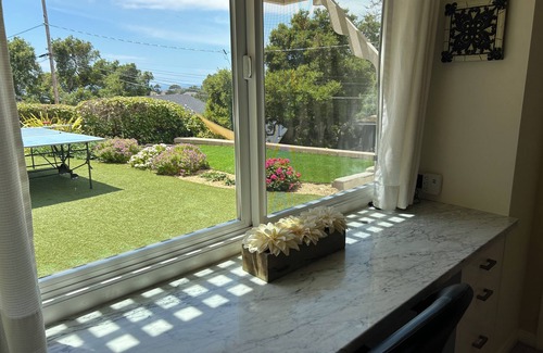 This enchanting home on the ocean side of the city has mountain and partial ocean views in a quiet neighborhood, walking distance to shops, dining and grocery and less than two minutes to downtown or one of several popular beaches.