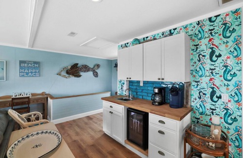 The updated bedrooms on the 2nd floor include two master bedrooms facing the ocean with sliding doors to the deck and hot tub, a queen bedroom and a bunk-room with two full size beds and a narrow twin. The king master features a Keurig, microwave, mini-fridge, a 40-inch TV, and newly renovated bathroom. Walkout the sliding doors onto the deck for the perfect place to enjoy your morning coffee or soak in the hot tub while relishing in the cool breeze and harmony of the surf. The queen master has a 32-inch TV, Keurig, newly renovated bathroom and sliding doors to the expansive deck. The queen bedroom, with a mermaid theme, has a 32-inch TV with direct access to the hallway bathroom. The bunkroom has a full-sized bunk bed, a narrow twin bed and a 32-inch TV. The queen room and bunk room share a hallway bathroom. Also located on the 2nd floor is a stacked washer and dryer.