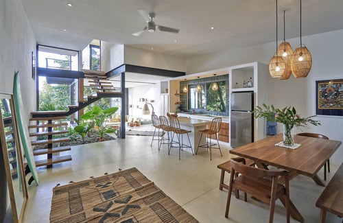 The architectural details that make Casa Layla an unforgettable escape also do not make it suitable for small children. The stairs to the sunk-in living room, open stairs to the master bedroom, open deck and pool with no perimeter alarm totally in line with law and regulations could be tricky for a toddler.