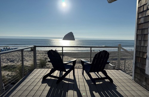 Ideal getaway right on the beach with a beautiful view of Haystack Rock! Just a short block to the Pelican Pub, grocery, and Cape Kiwanda. Watch the whales, surfers and the famous Dory boats while sitting in the large open great room. Watch the sunset while comfortably lounging next to the fireplace. Romantic primary suite with its own private deck and spectacular ocean view, new king bed and LCD crystal clear HD TV, has a private resort like grotto bath with a large jetted soaking tub and walk in stone shower. Bathroom has large window with great view of the ocean from the jetted tub. 100% cotton sheets throughout the home on cozy beds!