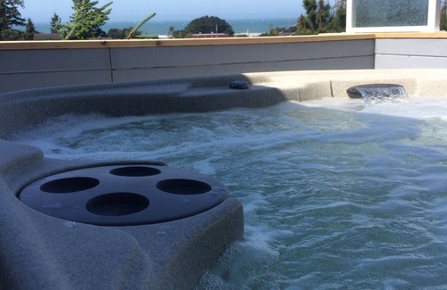 Ocean view, come relax and breathe in the fresh ocean sea breezes! Sunbathe on the outdoor back deck that also wraps around in front of the living room to the hot tub deck. Soothe your aches, pains and cares away in the tranquil waters of the hot tub. Custom modern house with open floor plan, airy and lofty wooden ceilings, and lots of natural light provided by many windows and several sliding glass doors. From the driveway ground level there is an outside covered stairway to the second level front door and small deck area. From the second level back deck there is a stairway down to the back yard. This yard is not fenced but animals, adults and children may be contained on the second level deck area with a closed gate.