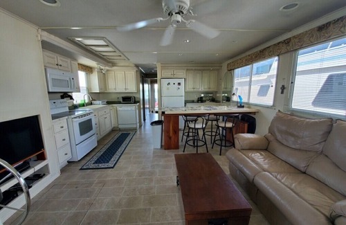 This houseboat is a 2 bed, 1.5 bath with full kitchen/bar and relaxing livingroom. Off the front you have a covered patio with a ceiling fan and the spacious roof top deck with great views of the bay.