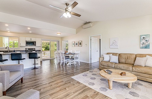 For a complete dining experience, pull up a chair on the lanai dining table or gather around the outdoor seating area. Allow the Hawaiian sea breeze to accompany your views of the beautiful pool and gardens of your paradise retreat.