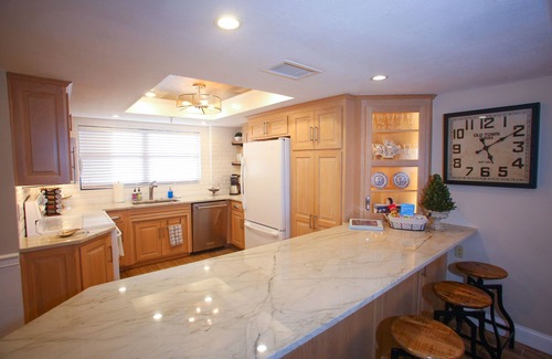 The newly renovated kitchen offers all the comforts of home with all major appliances including a refrigerator and freezer with ice maker, microwave, oven, toaster, dishwasher, and more. With granite counter tops and newer appliances including a coffee maker, cookware, kettle, utensils, dishes, and cutlery. Also, inside the unit is a full-sized washer and dryer, ironing board, and hair dryer. All linens are provided, and there is complimentary Wi-Fi and cable.