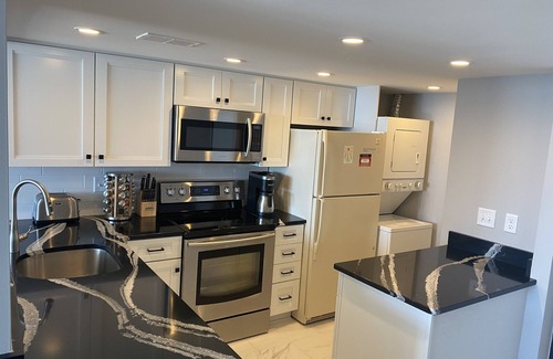 We have porcelain tile flooring throughout the living room, dining room, kitchen, both bathrooms and the hallway. Carpets cover the bedroom floors. We recently renovated the living room, dining room and kitchen. We knocked out a few walls in the kitchen to provide a more open feel with greater views of the ocean, beach and dunes. We are replacing the floors with porcelain tile, while keeping the carpets in the bedrooms. We are painting and putting up new cabinets and quartz countertops in the kitchen. We also have replaced the balcony doors and floor to ceiling windows.
