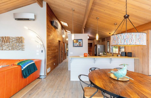 Boasting new furniture, this 2400 square foot retreat with an additional 1500 square foot deck also features 180-degree views of Puget Sound from the living room through large windows that invite the beauty of the outdoors in. Embark on a culinary adventure in a fully-equipped, retro 60’s kitchen before gathering around the 8-person dining table, puzzle table, or wood-burning fireplace. As you gaze toward the ocean, you may even spot whales or other wildlife in the distance!