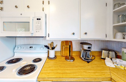 Inside, Bird Haus features a convenient, single-level floor plan. The open living area has recently updated decor and a 55-inch TV. The nicely equipped kitchen offers updated hardware and small appliances, as well as a two-seat breakfast bar that divides the kitchen from the charming dining area with a window-side table. Each of the two bedrooms has a Roku TV.