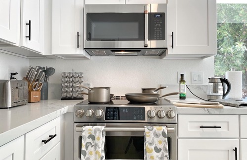 The newly renovated chef's kitchen is fully equipped with top-of-the-line stainless steel appliances, kitchenware, a spice rack, and coffee/tea stations. The large French door refrigerator provides ample space for food storage, while the Cafe induction cooktop offers a fast and precise way for food preparation and is safe for all ages.