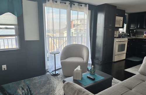 3 bedrooms ocean front home. Raised 2 family located on a dead end street at the waters edge. The elevated first floor is entirely yours and you have your own entrances, wrap around deck, and your own drive way that can accommodate up to 3 cars. Two bedrooms each with full sized beds and the third bedroom with 2 twin beds, all with heat. We have a queen size sleep sofa in the living room and full bath, fully equipped kitchen, Living room has a flat screen TV, games and books.
