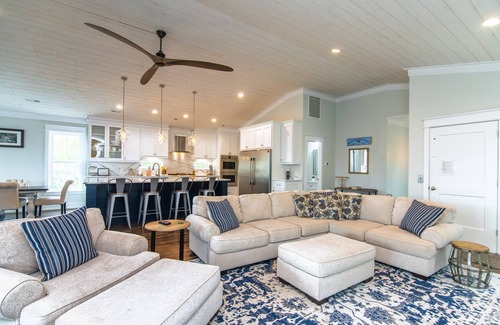 Sunkissed and happy, head back inside the modern farmhouse interior where you will instantly take notice of the spacious living room. Adorned with soft seating, a large TV, and a work desk -- this space is ready to entertain your family with movie marathons or game nights. The kitchen is a chef's dream -- boasting commercial-grade appliances, quartz countertops, a sprawling breakfast bar, and all the amenities to create a fine dining experience for all. The adjacent chef's pantry/kitchen gleams with its solid countertops, appliances, and enough shelving to store anything you need for your stay. Dining as a family will come naturally at the formal dining table. An oversized porch swing (a guest favorite) will invite you to chill while you take in the sound of the waves crashing on the shore.